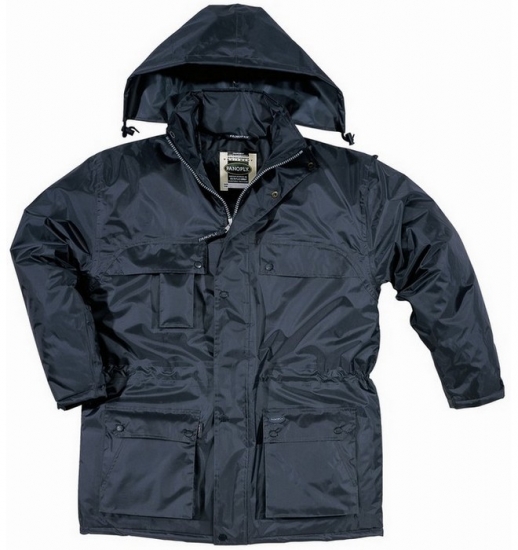 Poliéster com revestimento de PVC. Forro de Poliéster acolchoado. Capuz inamovível guardado dentro do colarinho num bolso com fecho de correr. Fecho de correr na frente mais dobra com botões de mola. Colarinho recto com fecho de correr até em cima. 2 bolsos baixos agregados com fole e dobra com botões de mola mais 2 bolsos sobrepostos para descanso das mãos. 2 bolsos no peito com fecho de correr mais dobra com botões de mola, um deles previsto para receber um crachá. 1 bolso no peito para telefone. 1 bolso interior para carteira. Cordão de aperto em baixo e na cintura. Punhos rectos com punhos corta-vento. Costuras impermeabilizadas. Modelo patenteado. - MATERIAIS: