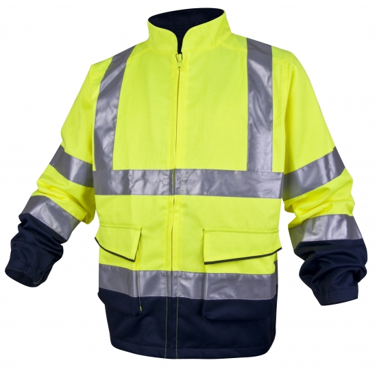Casaco de trabalho alta visibilidade PANOSTYLE. Punhos elásticos. 2 Bolsos. Alta visibilidade : Classe 2 - Cor prateada - Montagem em suspensório e em paralelo. - MATERIAIS: