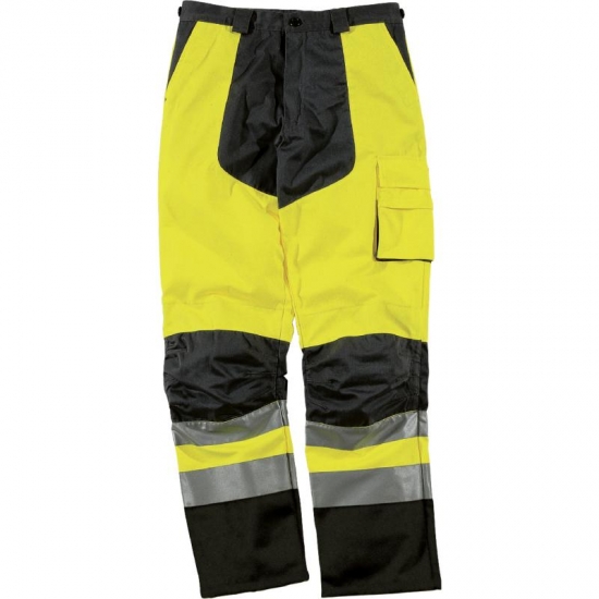 Calças de trabalho MACH HIGH VISIBILITY 60 % Algodão/ 40 % Poliéster. Classe 1. Bandas reflectoras 3M Scotchlite™ na parte inferior. Braguilha com fecho de correr sob carcela com botão. 1 bolso de chapa do lado esquerdo com fecho de correr debaixo de pala de fole com velcro. 2 bolsos de chapa com macho. Espaço para joelheiras fechado com velcro. Cós com passadeiras, ajustável dos lados com lingueta e 2 botões. Costas com 1 bolso de chapa com fecho de correr e 1 bolso de chapa. Costas com 1 bolso para régua.