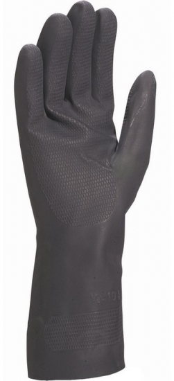 Luva de neopreno de 0,75 mm de espessura e 30 cm ou 38 cm de comprimento, interior flocado de algodão, palma e dedos com estrutura rugosa, manga com borda recta.