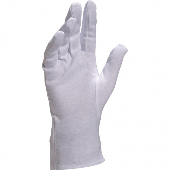 Luva de algodão branco, tipo usual, polegar agregado, punho com bainha de acabamento, montagem dos dedos tipo garfo.