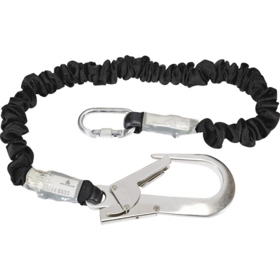 Anti-queda do absorvedor de energia extensível em correia tecida com deformação progressiva integrada ao cabo. Comprimento retratado: 1,40 m. Comprimento esticado: 2 m. 1 Mosquetão com bloqueio por parafuso em aço galvanizado, abertura de 17 mm (AM002). 1 Gancho com bloqueio automático em aço galvanizado, grande abertura de 55 mm (AM022). - MATERIAIS: