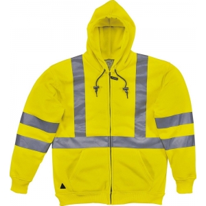 Sweat-shirt. Bandas reflectoras de cor prata 3M Scotchlite™ com microesferas, de 50 mm de espessura e montagem tipo boldrié. Categoria 3. Bolsos : 2. Capuz com aperto por cordão elástico com bloqueador . Modelo patenteado.