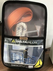 Kit anti-queda pronto a usar: Arnês 2 pontos de ancoragem anti-queda (dorsal - esternal). 2 anéis de regulação. 2 placas laterais ajustáveis. (Ref. HAR12). Anti-queda absorvedor de energia com cabo correia, comprimento de 2 m, equipado com 1 mosquetão AM002 e 1 gancho AM022 (Ref. AN203200CD). - MATERIAIS: