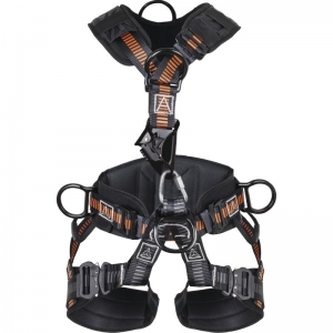 Arnês bicolor com cinto: 2 pontos de ancoragem anti-queda (dorsal - esternal). Cinto de estabilização com costas e perneiras termoformadas. 2 pontos de ancoragem de estabilização no trabalho (lateral). 1 ponto de suspensão. 8 anéis de regulação. 1 mosquetão.
